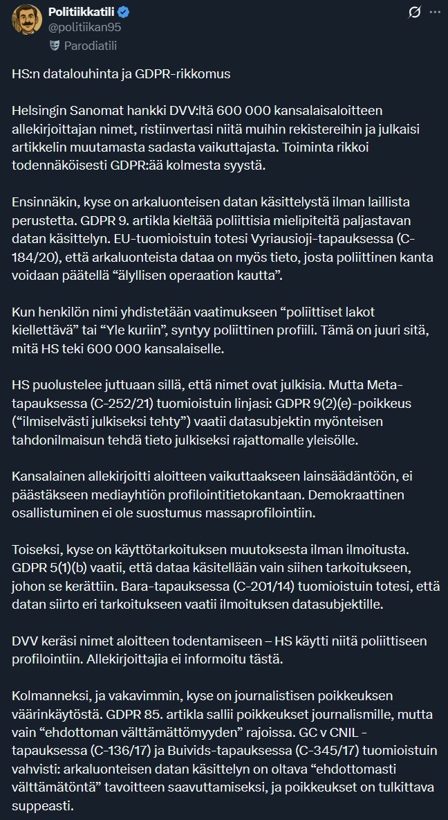 Mulle tässä haiskahtaa heti se, että ne on menneet (ja päässeet) penkomaan 600 000 ihmisten käyttäytymistä alotteissa ja sieltä valinneet itelleen mieleiset nimet. Ku kelaa mitä kaikkia tietoja ihmisistä ei saa kerätä tai kysellä niin taitaa HeSeli vaan kaivaa omaa hautaansa syvemmäksi.