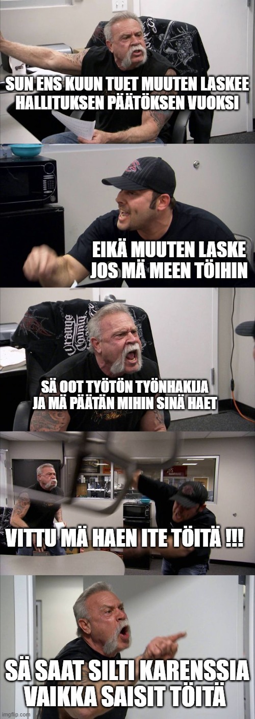 Mhm, kerran nimittäin mulla oli tiedossa vanha työpaikka johon mua pyydettiin uudestaan töihin. Tuli kuiteski taas se lappu, että sun pitäis nyt hakea tänne ja tänne töihin tai tulee karenssia. No mä soitin sille käsittelijälle, että tosiaan mun ei tarttis ku vähän yli kuukaus niin mä saisin taas töitä. Ei käynyt, pakko hakea tätä mitä me sulle käskettiin. No sit mä kysyin voisko tän työhaun vaihtaa tähän mun edelliseen firmaan? Ei käy, pakko hakea tähän mitä me sulle tarjotaan.